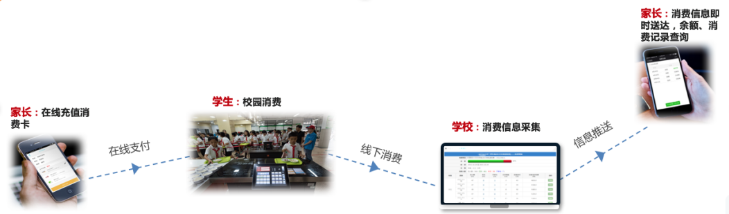 面向校园提供一站式费用收缴及管理服务,以互联网+移动支付技术帮助学校便捷完成不同消费场景(如学费、校服、饭堂、超市、医务所等)资金流的专户管理,提升收费效率,缩短收费周期,降低现金流转管理风险。同时学生的消费、充值情况,可以按天、按周、按月以微信推送的形式发送到家长手机。