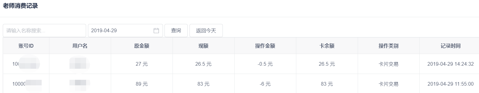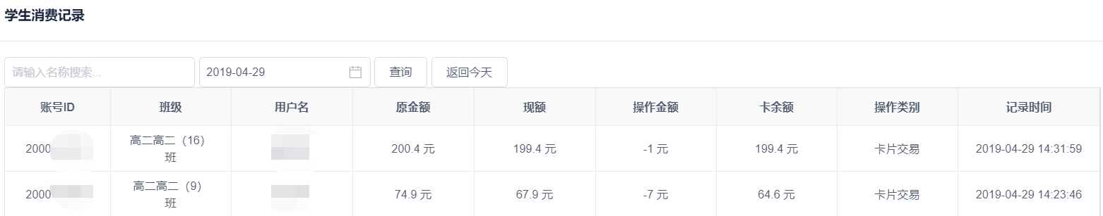 学生和老师的消费记录是分开的两个模块,但功能是一样的,都是记录每一笔交易金额的详细信息,如姓名、学生班级、原金额与消费后的剩余金额、消费金额、卡内余额以及交易时间。