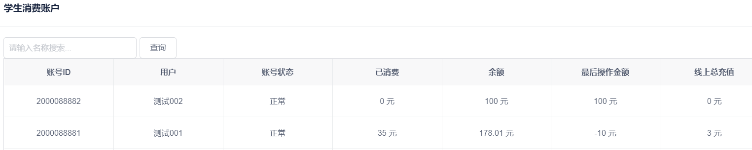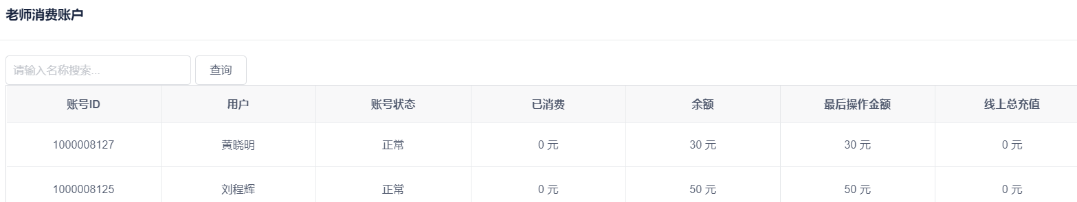 在学生和老师的消费账户模块中,可以查询学生和老师消费账号的状态是否正常,已消费金额、余额、最后一次消费金额、线上充值总额等信息。